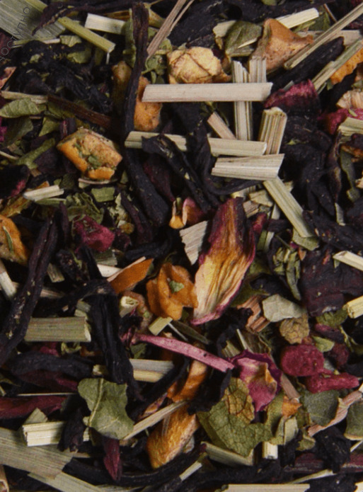 Купаж на основе каркаде и ройбоса , с добавлением листа смородины, лимонной травы, кусочков сублимированной малины, мяты, лепестков розы и кусочков сушеного яблока. Содержит пищевые ароматические масла.