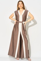 Комбинезон женский отрезной по линии талии, со спущенной линией плеча, со съёмным ремнём продергивающийся через шлёвки по боковым. Лиф переда с застёжкой на петли, пуговицы, по линии талии сборка.