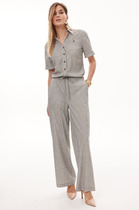 Комбинезон свободного силуэта со спущенным плечом и застежкой на потайную тесьму молнию с переди. Вырез горловины круглый. Рукав втачной 3/4. В боковых швах действующие карманы. Пояс на резинке, по переду пришивные декоративные элементы.