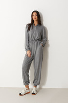 Комбинезон свободного силуэта. Вырез горловины комбинезона округлой формы, застежка на потайную тесьму-молнию в среднем шве спинки. Лиф детали переда комбинезона со средним швом, вверху разрез «V-образной» формы. На уровне талии обработаны 2 складки. Лиф детали спинки комбинезона со средним швом, на уровне талии обработаны 2 складки. На нижней части по шву притачивания пояса по центру обработана складка. Линия плеча спущена. Пояс втачной, по боковым сторонам вставлена эластичная тесьма. В боковых швах обработаны карманы.