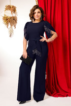 Комбинезон женский, полуприлегающего силуэта, с притачным поясом по талии. Лиф спинки с талиевыми складками, лиф переда со складками от пояса, с настроченными накладными карманами и клапаном. По лифу потайная застежка с притачной планкой. Брюки широкие с мягкими складками по талии, в боковых обработаны карманы. Линия плеча спущена, рукава длинные, по низу со складками, разрезом и притачной манжетой. По горловине воротник рубашечного типа на стойке. По талии втянут съемный пояс с полукольцами.