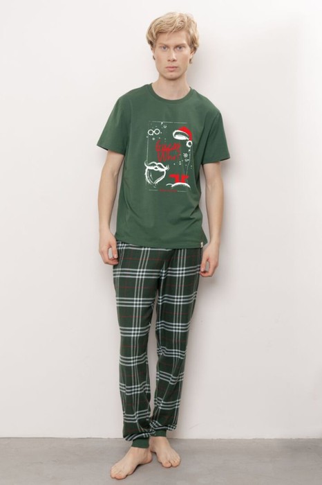Мужской комплект состоит из фланелевых брюки и классической футболки. Брюки свободного прилегания с манжетой по