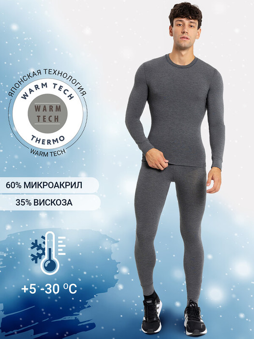 Мужской термо-компдект из полуприлегающего джемпера длиной до линии бедер  и облегающих брюк. Рукава джемпера длинные, на манжетах, горловина круглая. Брюки без боковых швов, на манжетах, с эластичной тесьмой в поясе. Все швы плоские и комфортные. В состав полотна, созданного по японской технологии, входит микроакрил, который благодаря своей толщине (меньше волоса человека в 10 раз), создает своеобразные воздушные карманы между нитями – именно за счет этого свойства джемпер так хорошо согревает. Благодаря эффекту натуральной шерсти выдерживает температуры до -30 градусов Цельсия. Зиму контролируете вы!
