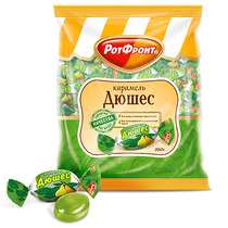 Традиционный «Грильяж в шоколаде» от фабрики «Рот Фронт» – тягучая полупрозрачная карамель, в которой увязли осколки дробленых лесных орехов. Вязкая сахарно-ореховая масса покрыта темной шоколадной глазурью и упакована в светло-зеленый бумажный фантик с оригинальными чуть золотистыми силуэтами белочек.