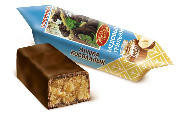 Конфеты «Мишка косолапый» – медовый грильяж – необычный формат старого доброго «Мишки». Мягкий, податливый грильяж из дробленых орехов, залитых натуральным медом, покрытый шоколадной глазурью. Конфеты тают во рту, легко раскусываются, раскрывая все грани вкуса: насыщенный ореховый, нежный медовый и терпкий шоколадный.