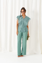 Костюм женский из кулирного полотна состоит из кофты и брюк. Кофта прямого силуэта. Горловина круглая. Рукав длинный, втачной на манжете. Низ изделия на поясе. На полочке принт в виде цветов. Брюки прямые, в боковых швах есть карманы. Верх на поясе с резинкой. Низ обработан на плоскошовной машине.