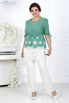Костюм женский из кулирного полотна состоит из кофты и брюк. Кофта прямой силуэт, горловина круглая, по центру планка с застежкой на петли-пуговицы, рукав втачной 3/4, низ обработан на плоскошовной машине, на полочке принт. Брюки прямые, верх на поясе с резинкой, в боковых швах карманы, низ брюк на манжете.