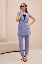 Костюм состоит из куртки на молнии и брюк. Брюки прилегающие, на эластичном поясе, на манжете, с лампасами из отделочного полотна. Куртка прямого силуэта, со спущенным плечом, с фигурной горловиной и линией низа. Рукав длинный, на манжете. На полочке расположен фигурный карман с обтачками из отделочного полотна.