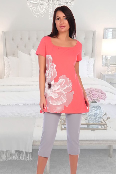Домашний костюм состоит из туники и бриджей. Туника из кулирки, на горловине отстроченные складки с кантом, по переду принт, по боковым швам разрезы, рукав короткий. Бриджи в обтяжку из кулирки с лайкрой. По низу изделий широкая подгибка.