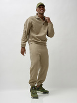 Мужской костюм. Кофта на молнии без капюшона, по бокам карманы. Рукава на манжете. Слева на груди вышивка в виде небольшой надписи. Брюки прямые. Спереди два кармана. Слева под карманом вышивка в виде небольшой надписи.