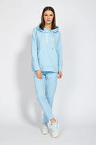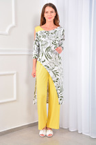 Костюм состоит из брюк и кофты. Брючки на поясе с прорезными карманами в боковых швах, снизу на манжетах. Кофта с длинным рукавом, горловина обработана обтачкой, на полочке печать.