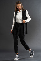 Костюм с брюками, спортивного типа. По бокам брюк лампасы молочного цвета. Брюки с карманами, в пояс вдет шнурок. По низу брюк черные манжеты с принтом. Кофта приталенного силуэта, по низу и на рукавах черные манжеты с принтом. Горловина обработана окантовкой.