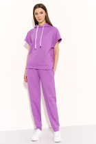 Костюм женский с брюками. Толстовка трехцветная, свободной формы со спущенными плечами, длинными рукавами, с капюшоном, низ на завязках. Брюки полуприлегающего силуэта с карманами. Молния на карманах с принтом в виде надписи. На брюках по бокам широкие лампасы, низ на манжетах, пояс на резинке.