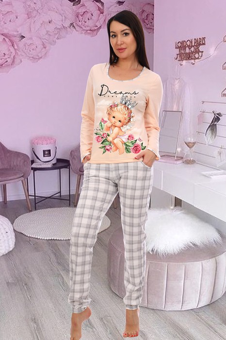 Комплект состоит из туники и брюк. Туника прямого силуэта, с округлой горловиной. Рукав втачной, длинный. Брюки длинные, с карманами, на поясе, внизу на резинке. Горловина, низ рукавов и вход в карман обработаны бейкой из основного полотна