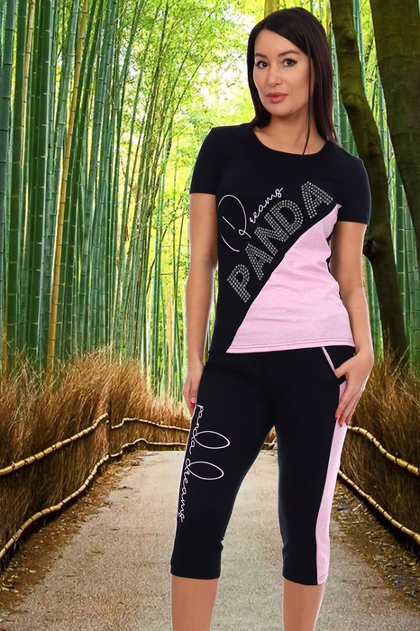 Костюм молодежный прилегающего силуэта в спортивном стиле. На футболке и бриджах принт. Бриджи на эластичном поясе, с двумя боковыми карманами. Модель из ткани контрастных расцветок, отлично подходит для активного отдыха.