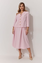 Комплект состоит из футболки и брюк. Брюки на эластичном поясе, с карманами, с лампасами вдоль боковых швов. Спереди по шву притачивания пояса заложены складки. Футболка прямого силуэта, с асимметричным низом и обработанным разрезом в нижней части удниненного бокового шва. На полочке расположены симметричные кокетки. Горловина обработана обтачкой. Рукав цельнокроеный короткий, обработанный бейкой из основного полотна.