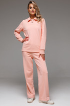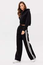 Костюм состоит из толстовки и брюк. Брюки на поясе, с боковыми карманами, с лампасами из отделочного полотна по боковым швам, на эластичном манжете. Толстовка прямая, на молнии, с капюшоном, с карманами "кенгуру", длиной до середины бедра. В нижней части боковых швов обработаны разрезы-шлицы, украшенные декоративной тесьмой. Рукав длинный, с лампасами из отделочного полотна вдоль рукава, на эластичном манжете.