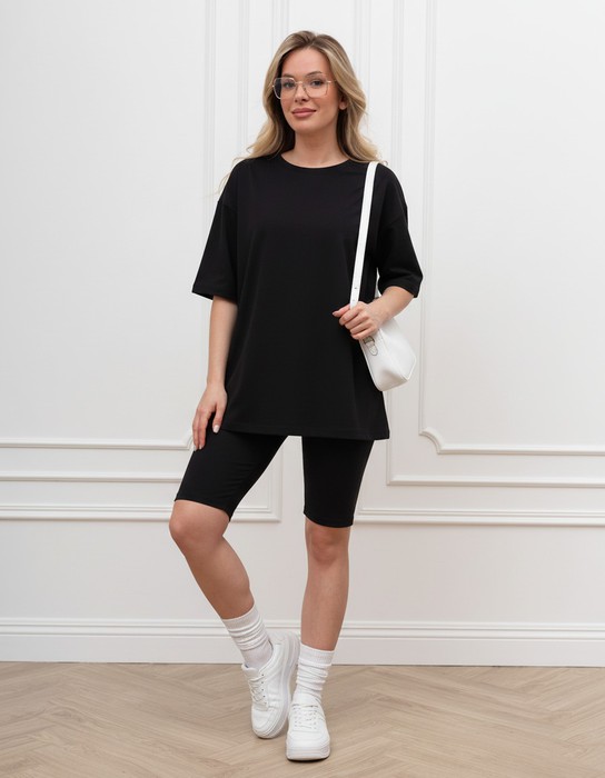 Костюм женский из гладкокрашенного трикотажного полотна в рубчик («лапша»), состоящий из футболки и леггинсов. Футболка – удлиненная, свободного покроя, со спущенной, линией плеча, короткими втачными рукавами, горловиной овальной формы, обработанной втачной планкой.Леггинсы – длиной до колен, с эластичной тесьмой по талии.
