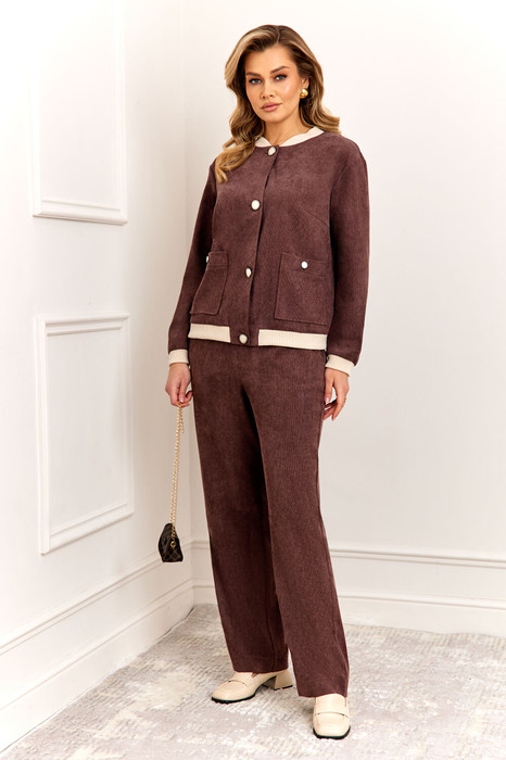 Стильный и современный комплект, состоит из бомбера и брюк. Бомбер полуприлегающего силуэта, выполнен из премиальной ткани Вельвет с добавлением вискозы. Бомбер без подкладки, по переду с застежкой на металлические пуговицы и накладными карманами с застежкой на пуговицу. Стойка горловины бомбера и манжета рукава выполнены из мягкого трикотажного довяза, что придет модели особый стиль и комфорт при носке. Рукав втачной, полной длины. Брюки прямые, слегка зауженные к низу, выполнены из премиальной ткани Вельвет с добавлением вискозы. Пояс брюк полностью на резинке, в боковых швах функциональные карманы.