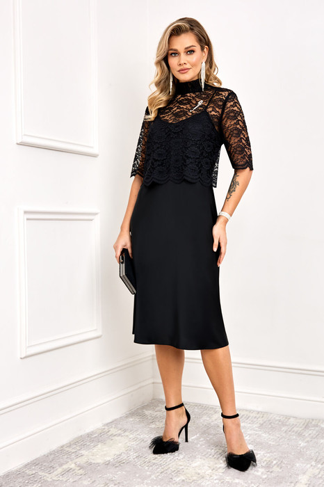Элегантный и нарядный комплект, состоит из блузы и платья. Блуза выполнена из французского кружева высочайшего качества. Блуза прямого силуэта, с втачным рукавом. Горловина блузы со стойкой и вырезом-капелькой, с застежкой на пуговицы. Блуза декорирована съемной дизайнерской булавкой серебристого цвета, что придает модели особый шарм. Платье-комбинация А-силуэта, выполнена из атласной ткани с добавлением вискозы. Модель прекрасно подойдет для торжественного мероприятия и ежедневной носки.