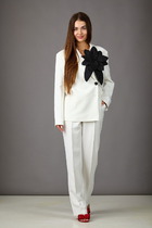 Брюки прямого силуэта с заутюженными стрелками и притачным поясом. Для максимально комфортной посадки по бокам пояса вставлена эластичная резинка. Застёжка на молнию с гульфиком и пуговица по поясу. По переду в боковых швах карманы. Задние половинки брюк с талиевыми вытачками. Длина жакета 74 см, длина рукава 62 см, длина брюк 112см.