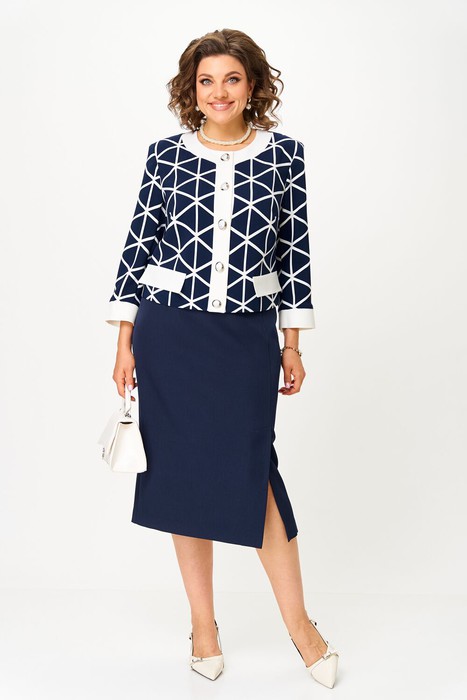 Комплект двух-предметный, состоящий из жакета и юбки. Жакет с декоративной контрастной отделкой, прямого силуэта с центральной застёжкой на петли и пуговицы, горловина округлой формы. По переду жакета нагрудные вытачки и декоративные клапаны. Спинка жакета со средним швом Рукав втачной, двухшовный с манжетой по низу. Жакет на подкладке по переду. Юбка прямого силуэта со шлицей спереди по левой части. Пояс притачной с эластичной тесьмой по спинке, что обеспечивает максимально комфортную посадку на любой тип фигуры. Длина жукета 54см, длина рукава 52см. Длина юбки 77см.