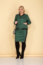 Костюм в стиле спорт-шик сочетающий в себе женственность и комфорт. Сочетание двух тканей трикотажного полотна и костюмной ткани добавляет оригинальность. Жакет со спущеным плечем и декорирован печатью по левой части переда, воротник пиджачного типа. По пинии плеча паты с полукольцом. Рукав втачной одношовный с манжетой по низу. Спинка с кокеткой и отлетной планкой. Понизу довяз и регулируемая кулиса. Брюки, слегка зауженные к низу, свободного силуэта. По переду вблизи боковых швов карманы. Для максимально комфортной посадки по поясу вставлена эластичная резинка.