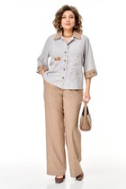 Женский костюм выполнен в элегантном повседневно-деловом стиле с акцентом на комфорт и современную лаконичность. Комплект состоит из свободной блузы-рубашки и прямых широких брюк, выдержанных в мягкой природной цветовой гамме: светло-серый верх гармонично сочетается с тёплым бежевым оттенком низа и отделочных деталей.Блуза свободного силуэта смотрится легко и непринуждённо, при этом сохраняет аккуратный и собранный внешний вид. Контрастный отложной воротник и манжеты в цвет брюк создают завершённый, цельный образ. Накладные карманы на полочке подчёркивают практичность модели и добавляют лёгкий акцент в стиле casual. Центральная застёжка на пуговицы делает изделие удобным и функциональным.