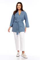 Жакет женский полуприлегающего силуэта, на подкладке, с ассиметричной застёжкой на пробивной люверс и пояс по левой стороне переда застёгивающийся на две петли и пуговицы, с внутренней застёжкой на петлю и пуговицу. Перед с рельефными швами, по правой части прорезной карман с листочкой. Спинка с рельефными швами и средним швом. Рукава втачные, двухшовные, длинные. Воротник отложной с отворотом.