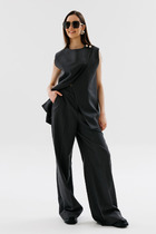 Брюки прямого силуэта с эмитацией запаха на притачном поясе. По переду застежка на тесьму-молнию. По боковым действующие карманы.