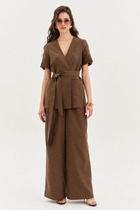 Жакет свободного силуэта с застежкой по переду на кнопки. Воротник отложной. По переду отрезные кокетки, накладные карманы с клапанами. По спинке кокетка и рельефы. Рукав двухшовный с притачной манжетой на кнопках. Низ жакета на притачном поясе.