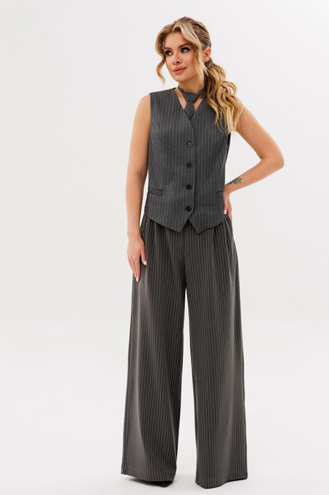 Брюки женские, свободного силуэта, на поясе со шлевками. Застежка на молнию и пуговицу. По переду заложены складки. По бокам действующие угловые карманы.
