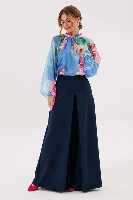 Юбка-брюки А-силуэта с застежкой на потайную тесьму молнию с притачным поясом и карманами спереди. По переду встречная складка.