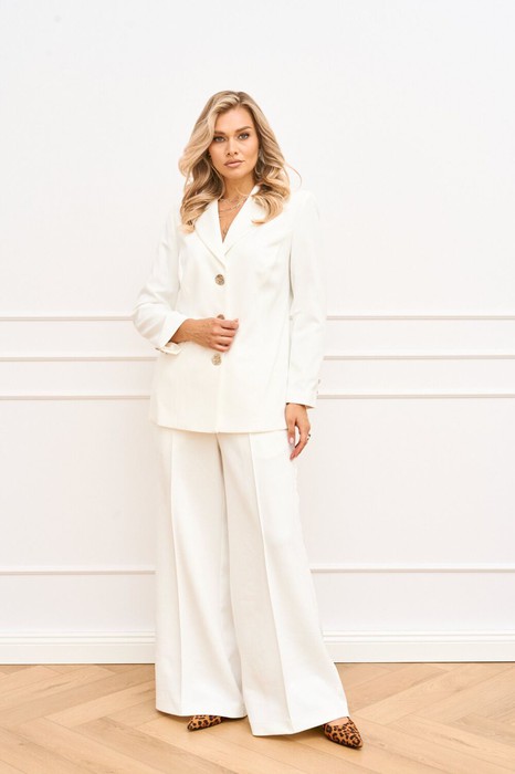 Костюм женский с брюками выполнен из двух видов ткани из мягкого и приятного в носке замша и практичной в носке костюмной ткани. Жакет женский полуприлегающего силуэта, по полочке обработаны рельефные швы. Центральная часть полочки, воротник и подборт выполнены из замша, спинка, рукав и боковая часть полочки из костюмной ткани. Воротник пиджачного типа, застежка центральная на петли и пуговицы. Спинка со средним швом и рельефами. Рукав втачной двухшовный в локтевом шве рукава обработана по низу шлица не функциональная с петлями и пуговицами.