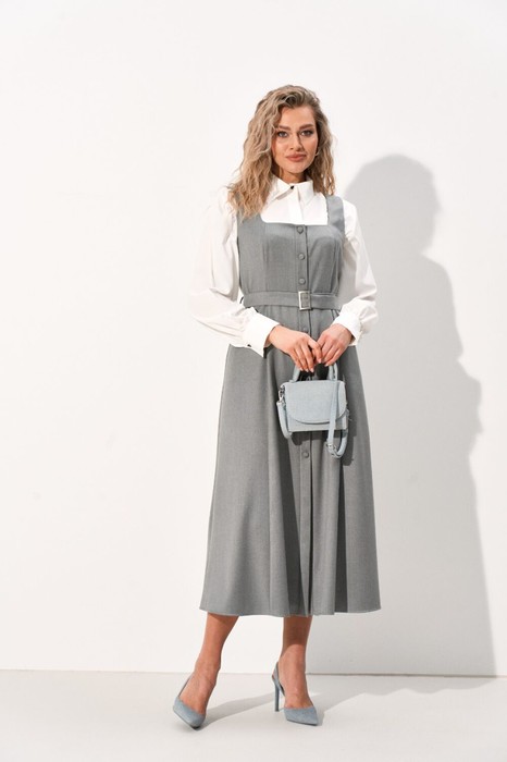 Женский комплект состоящий из сарафана и блузки. Сарафан из костюмной ткани, отрезной по линии талии, юбка имеет А-силуэт благодаря чему выгодно подчёркивает фигуру. По полочке и спинке обработаны рельефы, которые зрительно вытягивают фигуру. Вырез круглый, по спинке вырез дополнен перемычкой, бретели цельнокроеные. Застёжка центральная на притачных планках застегивающаяся на пробивные кнопки. По юбке полочки в области талии обработан карман с отрезным бочком. Сарафан дополнен съемным поясом из основной ткани застегивающийся на пряжку, который фиксируется шлевками по боковым швам. Блузка прямого силуэта идеально сочетает в себе комфорт и стиль. В блузке классический рубашечный воротник и удобная центральная застежка на потайной планке на петли и пуговицы. Рукава втачные со сборкой по низу что обеспечивает эффектный объемный вид, по низу обработан притачной манжет застегивающийся на петлю и пуговицу. По полочке в области груди подрез. По спинке кокетка, переходящая на полочку и бантовая складка от кокетки. В боковых швах по низу обработаны разрезы