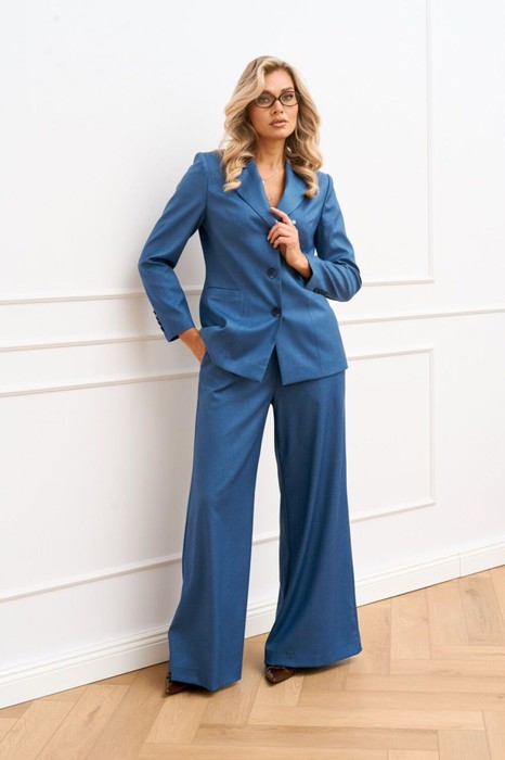 Костюм женский с брюками выполнен из костюмной ткани. Жакет полуприлегающего силуэта на подкладке, по полочке обработаны рельефные швы и в области талии прорезной карман листочка. Воротник пиджачного типа, застежка центральная на петли и пуговицы. Спинка со средним швом и рельефами. Рукав втачной двухшовный в локтевом шве рукава обработана имитация шлицы с пуговицами. Брюки прямого силуэта, верхний срез брюк на притачном поясе с эластичной тесьмой, в боковых швах карман с отрезным бочком.