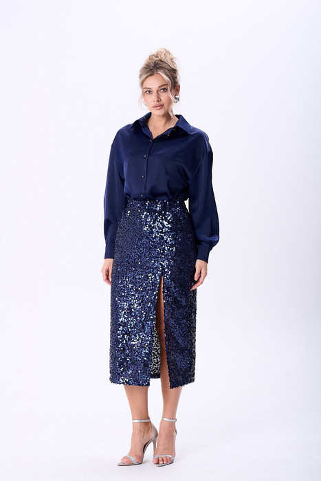 Костюм женский состоящий из юбки из сверкающей ткани в пайетки и блузки из сатина. Юбка прямого силуэта на подкладке длинной миди, на переднем полотнище обработан разрез. Верхний срез юбки обработан эластичной тесьмой что обеспечит комфортную посадку изделия