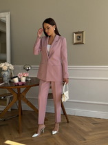 Костюм женский двойка состоящий из жакета на подкладке и брюк. Жакет полуприлегающего силуэта с центральной застёжкой на петлю и пуговицу, воротник пиджачного, по полочке с левой стороны в области груди обработан прорезной карман листочка-обманка, в области бёдер функциональные прорезные карманы с клапаном. Рукав втачной, двухшовный по низу в локтевом шве обработан разрез. Спинка цельнокроеная с отрезным бочком, переходящим на полочку.
