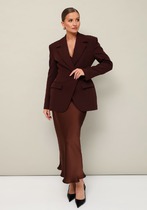 Костюм женский тройка, состоящий из облегчённого жакета, блузки и брюк. Жакет удлинённый выполнен из трикотажа букле прямого силуэта, линия плеча слега спущена, рукав длинной 7/8. Застежка центральная на притачных планках, по полочке в области бёдер обработаны накладные карманы.