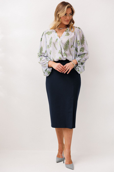 Бренд белорусской женской Anastasia представляет костюм двойку. Комплект женский 2-предметный (блузка и юбка) станет отличным дополнением к Вашему гардеробу. Подойдет для повседневной носки (работа, офис, прогулки). Блуза из шифоновой ткани, полуприлегающего силуэта. По полочке идет нагрудная вытачка из бокового шва. Вырез V-образной формы с планками и складкой по центру. По спинке средний шов, рукав объемный, по окату сборка. Низ рукава фигурный, на резинке. Юбка  зауженная к низу, по полочке по линии колена - шлица. По спинке: средний шов, молния, пояс отрезной с резинкой.  Длина спинки (блузки): -71 см.  Длина рукава: -58 см. Длина юбки -75см