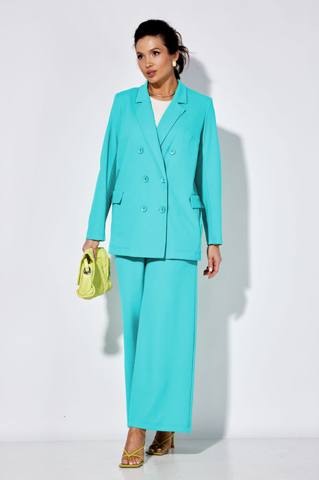 Костюм женский 2-х предметный: жакет и брюки. Жакет полуприлегающего силуэта: бочок с выточкой по полочеке, по спинке средний шов. Застежка двухбортная, карман клапан "обманка". Рукав двухшовный. Брюки прямые .По полочке карман и складки. Пояс на резинке. Длина жакета: 73см . Длина рукава: 62см. Длина брюк: 100 см.
