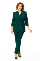 Комплект женский 2-хпредметный (блузка и брюки). Блузка женская из текстильной ткани.  Модель прямого силуэта, рукав углублённый , рубашечного типа. Перед идет с запахом, низ блузы ассиметричный, по полочке углы, спинка закруглённая, удлинённая. По рукаву идут защипы.В качестве декора-логотип фирмы на горловине. Брюки из текстильной ткани, прямые, зауженные к низу за счет защипов. Пояс на резинке, по бокам карманы. Длина по спинке: 80см. Длина рукава: 47см. Длина брюк (48-52) -93см, (54-58)-95см