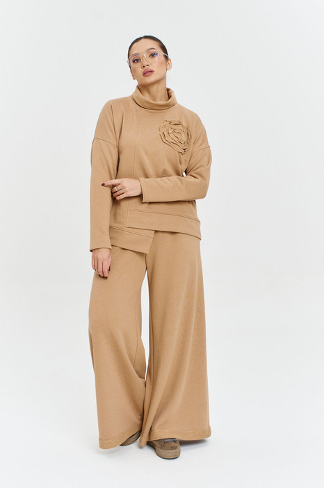 Шикарный трикотажный женский костюм от бренда Anastasia, идеальный для любого случая. Этот костюм сочетает в себе элегантность и комфорт, что делает его подходящим как для деловых встреч или домашней одежды, так и для праздничных мероприятий Идеальный на холодную погоду. Блуза прямого силуэта со спущенным плечом, низ по полочке фигурный, асимметричный и подрез в виде запаха. По низу снинки и полочки идет отрезной пояс. По полочке -декор в виде настроченного цветка из этой же ткани. Воротник - стойка хамут. Брюки, расширенные к низу, пояс на резинке, по бокам карманы. Отворот по низу на изнанку.Это не только универсальная одежда для деловых встреч или прогулок, но и идеальный выбор для различных торжественных мероприятий, подойдет как для взрослых женщин, так и для подростков. Отдельный части костюма легко будут сочетаться с вещами из Вашего гардероба. Модель можно отнести к стилю спортивный кэжуал, оверсайз, спортивный шик. Костюм можно носить с кроссовками или ботинками. Обязательно добавьте наш бренд в избранное и следите за новинками, распродажами, скидками и акциями! Хороших покупок от «Анастасия» Длина блузы (по спинке):(50-54)- 61см, (56-60)-62 см. Длина рукава: (50-60)-45см. Длина брюк: (50-54): 101см, (56-60)-104см