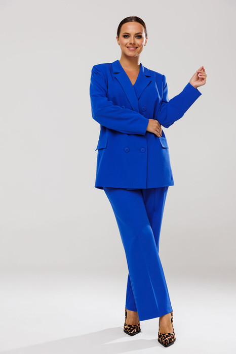 Костюм женский 2-х предметный: жакет на подкладке и брюки. Жакет полуприлегающего силуэта: бочок с выточкой по полочеке, по спинке средний шов. Застежка двухбортная, карман клапан "обманка". Рукав вточной двухшовный. Брюки прямые со стрелками. Застежка по передней части на молнию. Пояс отрзной, по бокам вставлена резинка. Длина жакета: (48-52)73см, (54-58)-74см . Длина рукава: (48-58)-62см. Длина брюк: (48-52)-105 см, (54-58)- 107см