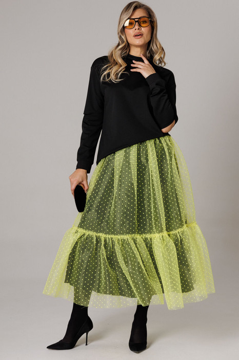 Оригинальный женский комплект от бренда Anastasia, идеальный для любого случая. Этот костюм сочетает в себе элегантность и комфорт, что делает его подходящим как для повседневной носки, так и для праздничных мероприятий. Джемпер оверсайз из трикотажного полотна. Прямого силуэта со спущенным плечом. Воротник-стойка. По рукаву идет подрез с разрезом. Низ рукава и низ джемпера - на манжете. Джемпер лекго сочетается с любыми низами: брюки, джинсы, юбка. Юбка макси из 2-х видов ткани: верх с отрезным валаном из органзы, подкладка юбка солце из шифона. Пояс на декоративной резинке. Фасон универсален, а использование резинки на поясе повышает комфортность носки, позволяя юбке адаптироваться под индивидуальные особенности фигуры. Юбку легко сочетать с различными верхами: топ, блузка, футболка, кружевной жакет, свитер или жакет из тексиля - все это позволит создавать различные образы на разные случаи. Длина по спинке 68см. Длина рукава (с манжетой): 60см. Длина юбки: 90 см