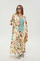 Комплект состоит из блузки топа и брюк. Блузка выполнена из однотонного креп-шифона, топ выполнен из блузочной однотонной ткани, брюки выполнены из однотонной струящейся ткани, контрастной по цвету.