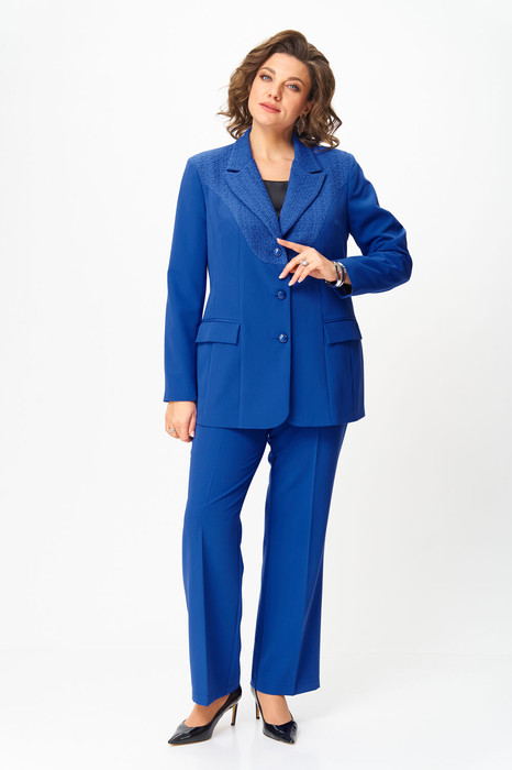 Костюм полуприлегающего силуэта, состоящий из жакета и брюк, выполнен из однотонной костюмной ткани. Ткань верха имеет механическое растяжение благодаря содержанию в ней эластана. Брючный костюм идеальный вариант как на торжественные мероприятия, так и отличный офисный вариант.