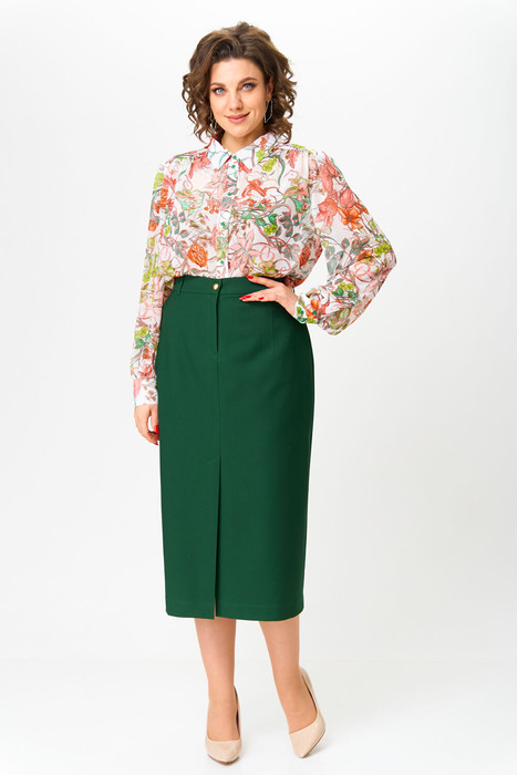 Комплект женский двухпредметный, состоит из классической прямой юбки со шлицей спереди и шифоновой блузки. Блузка с салатовыми и красными цветами, с объемными рукавами на манжетах прекрасно впишется в любой гардероб. Шифоновая блузка с планкой на пуговицах прекрасно сидит на фигуре, прямой крой вещи вытягивает силуэт, скрывает несовершенства и подчёркивает достоинства.