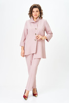 Прямой двухбортный жакет, брюки на резинке по спинке и с карманами.