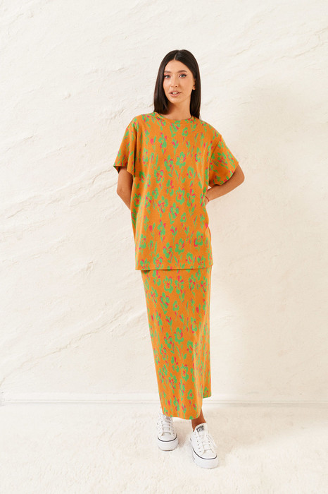 Комфортный комплект состоит из джемпера и юбки выполнен из полотна с цветочным принтом. Характеристики джемпер прямого свободного кроя, горловина овальная, рукав слегка спущен, спинка цельнокроеная. Длина по спинке 72 см, длина рукава 39 см от края горловины. Юбка полуприлегающего силуэта, пояс - резинка, в среднем шве заднего полотна изделия разрез 49 см. Длина юбки 92 см.